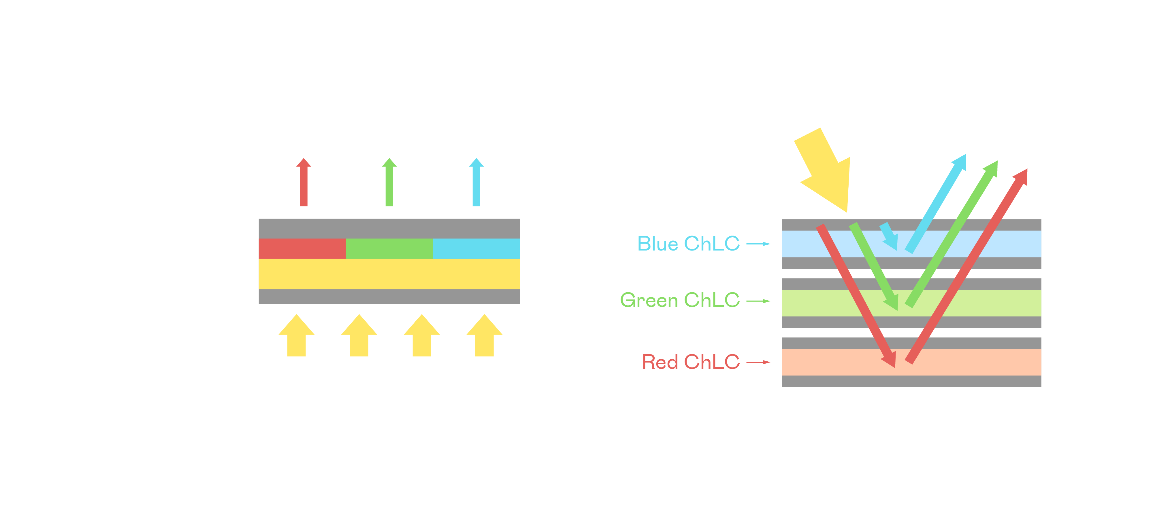 冰球突破胆固醇液晶显示器是由红、绿、蓝三层胆固醇液晶面板堆叠而成,并采用无彩色滤光片设计,减少环境光在反射过程中的损耗。