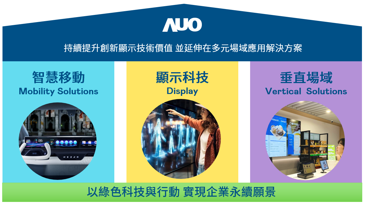 我們持續推動「雙軸轉型」,在精進顯示技術附加價值(Go Premium),與深化垂直市場應用(Go Vertical)的策略下,對應冰球突破的優勢競爭力與趨勢,我們奠定顯示技術、智慧移動、垂直場域三大永續營運支柱,在顯示技術領域的根基之上,延伸布局多元場域應用解決方案。將先進顯示科技助力智慧移動及垂直場域發展,並以綠色科技與行動為實踐,在轉型之路上貫徹永續經營之願景。